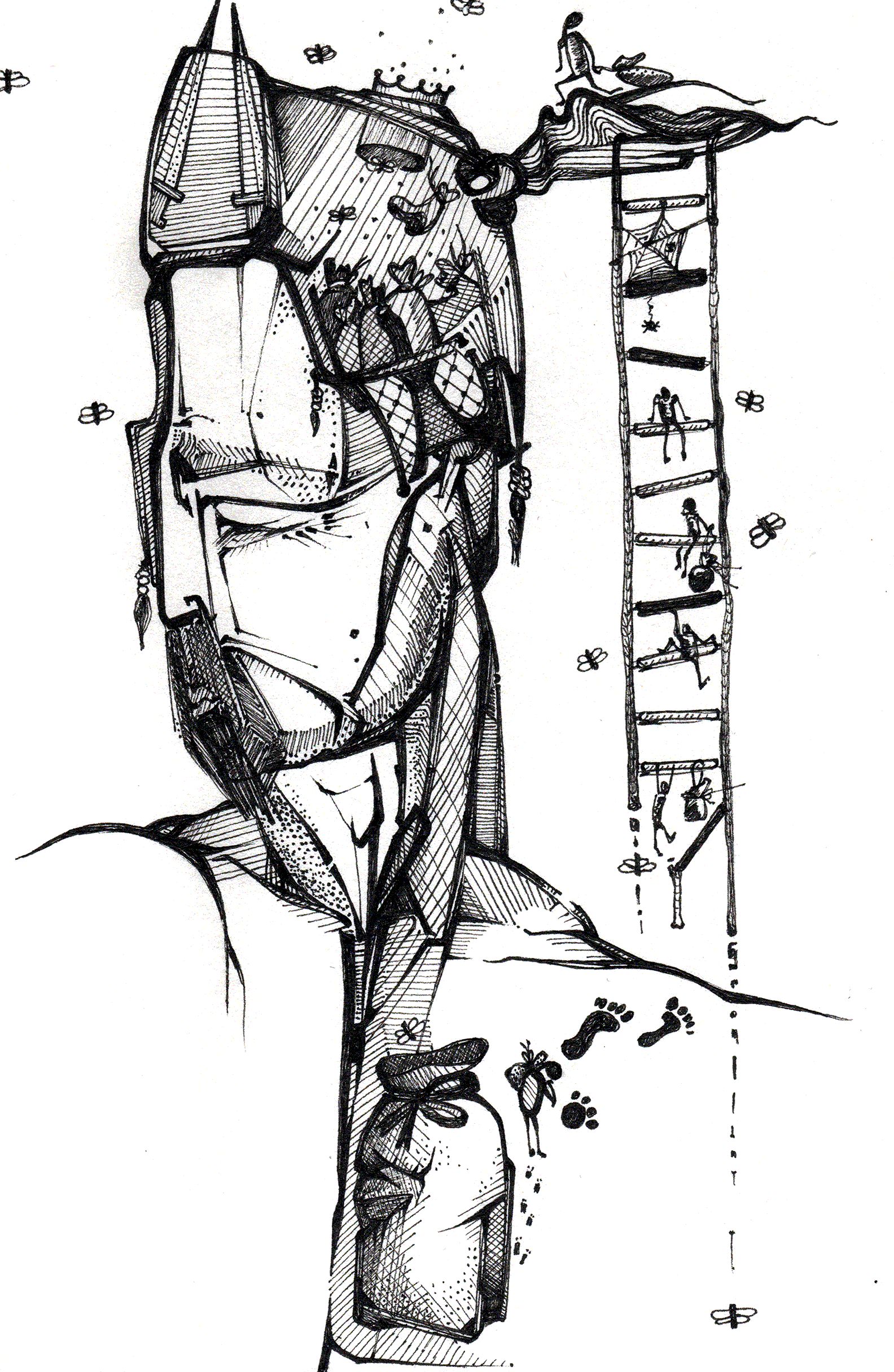This story is about how we create a mess in our heads. A story illustrating how dirty feelings - anger, greed, envy, arrogance, and the like - bring dirty thoughts into consciousness. And what is this door through which nefarious feelings manage to pollute the mind? This is pride and arrogance, a sense of one's own greatness and superiority. Symbolically, these states are reflected in the picture as the crown, through which the “garbage” is accumulated in the head of our hero. And from this garbage, swords (wars, battles) rise in the mind and grow in consciousness.