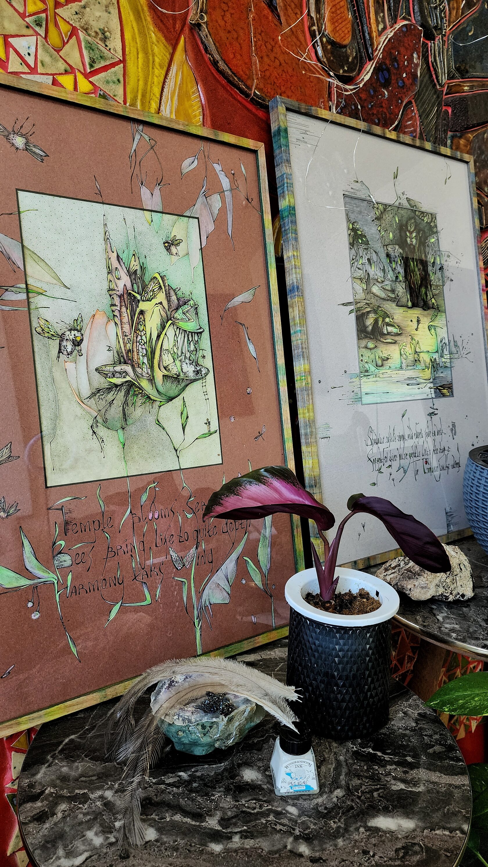 This artwork is a reminder: the unseen is not absent. It lives in the shadows, between breaths, and in the soft hum of dusk. If only we are willing to see. In this creation, I've delved into the unseen depths of our psyche and the universe beyond. Through frantic pen strokes and rich pigments, I've conjured a realm where the metaphysical and surreal converge, populated with symbolic entities. It's a visceral journey through the primal and the mystical, an invitation to peer beyond the veil of reality. This piece will imbue your space with the mysterious energy of hidden worlds, stirring the soul and sparking the imagination.